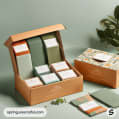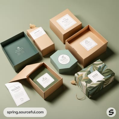 Green gift boxes with scenic illustrations and natural elements.