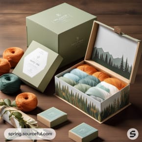 Nature-themed gift packaging with mountain art designs.