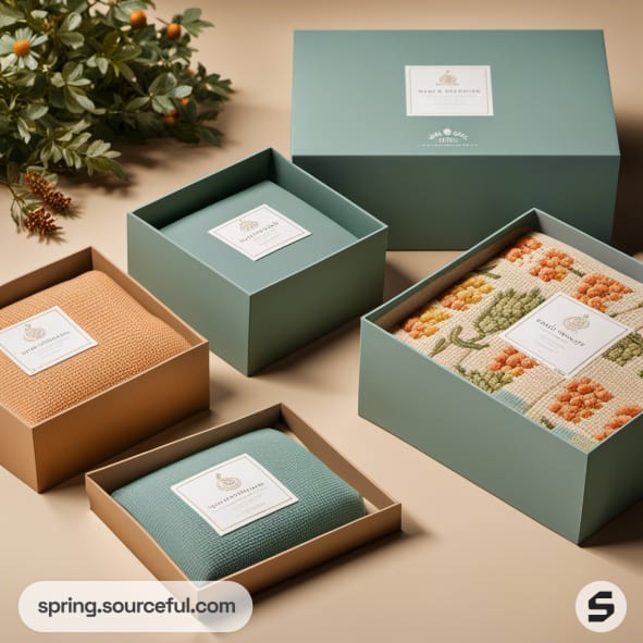 Assorted gift boxes in pastel and earthy shades.