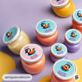 Assorted small jars with penguin artwork and pastel lids.