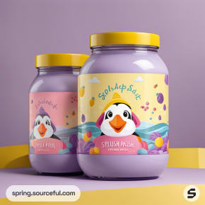 Purple jars with yellow lids and joyful penguin graphics.