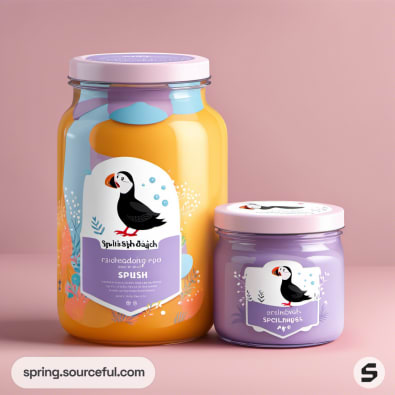 Jars with penguin labels in orange and purple hues.