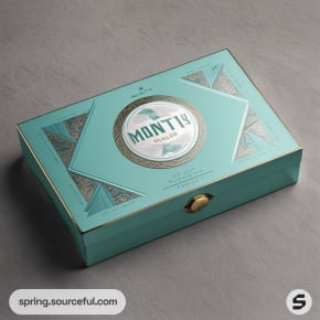 Large teal box with a circular design centerpiece on a textured surface.