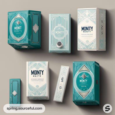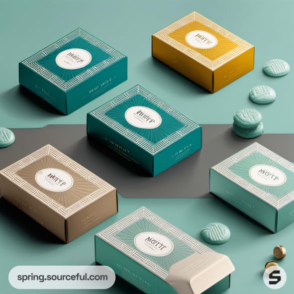 Vertical teal and cream boxes with ornate designs on a beige backdrop.