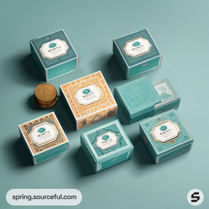 Array of teal and gold boxes in various sizes with decorative designs on a teal background.