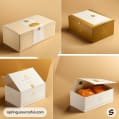 Elegant white and gold square gift boxes with floral patterns and detailed embellishments.