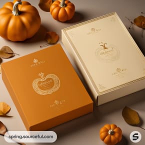 Two elegant gift boxes in autumn colors with pumpkin designs, surrounded by small pumpkins and leaves.