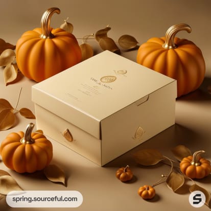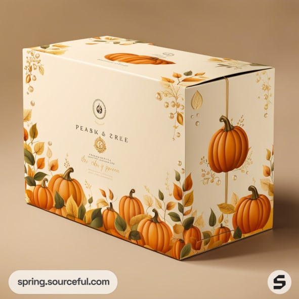 Gift box with autumn pumpkin design, featuring orange pumpkins and leaves on a beige background.