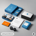 Blue and beige product display boxes with tech items on a light blue surface.