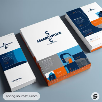 Blue and orange technology-themed boxes with documents on a gray surface.