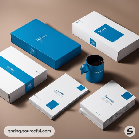 Blue and white product kits with mugs and folders on a table.