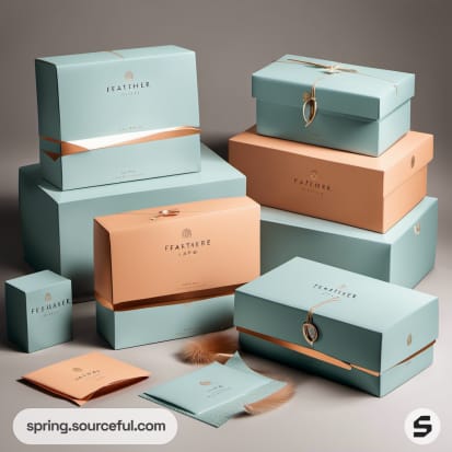 Elegant box packaging in blue and copper with various sizes and shapes.