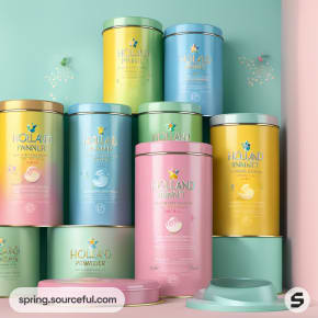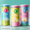 Pastel-colored cylindrical tins stacked with 'Holland Powder' label.
