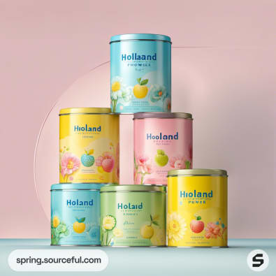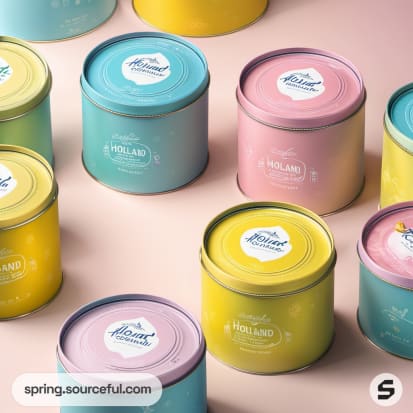 Pastel-colored cylindrical tins with sealed tops displaying 'Holland.'