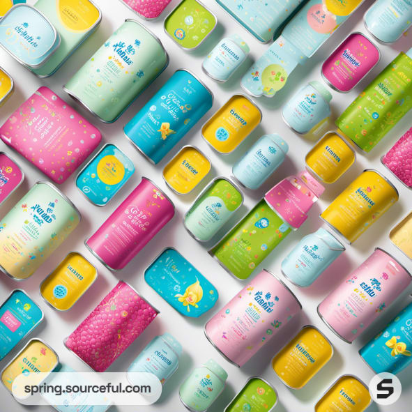 Stacked cylindrical cans with fruit illustrations and pastel colors.