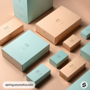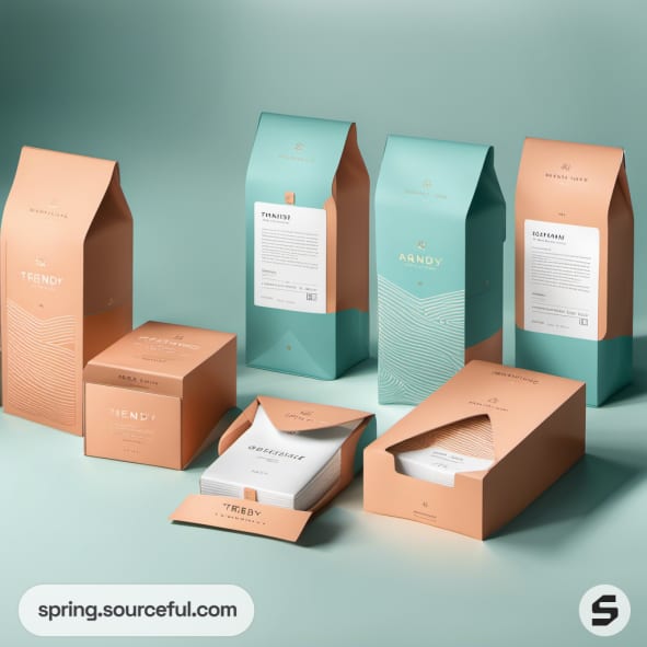 Two standing pouch boxes and two boxes with paper wrappers in teal and peach tones.