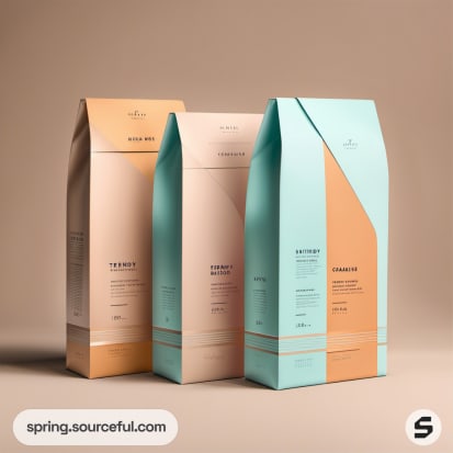 Three tall pouch boxes in peach and teal with minimalist labels.