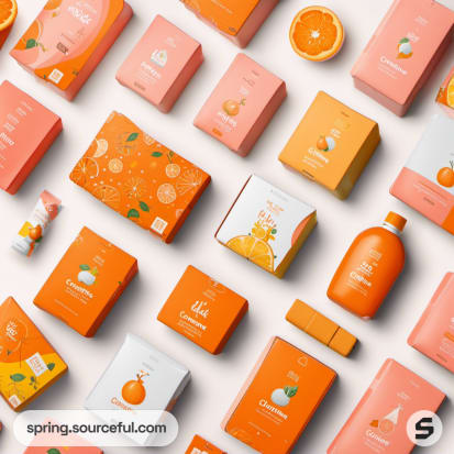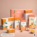 Assorted orange-themed packaging with citrus graphics on a peach background.