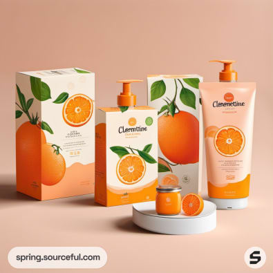 Clementine-themed packaging with lotion bottles and boxes on a peach backdrop.