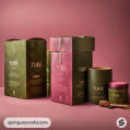 Green and pink tall boxes with cylinder packs and wooden utensils on a pink background.