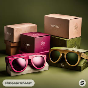 Stacked pink and green boxes with sunglasses, against a green backdrop.