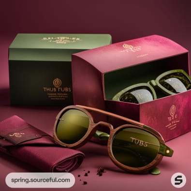 Two sunglasses displayed with green and pink boxes, on a maroon background.