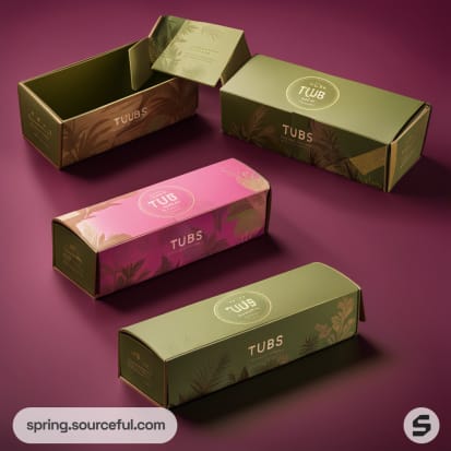 Stacked pink and green rectangular boxes with nature-themed designs.