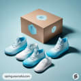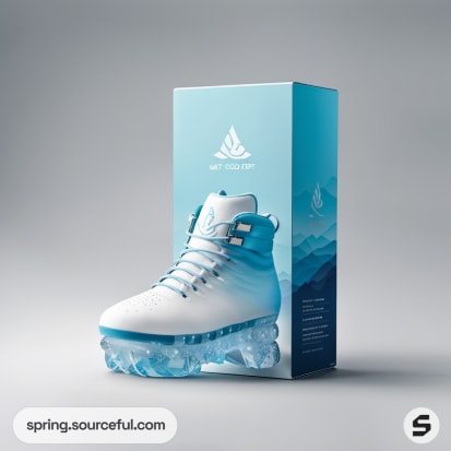 Sneaker displayed with blue-themed packaging, white shoe on icy backdrop.