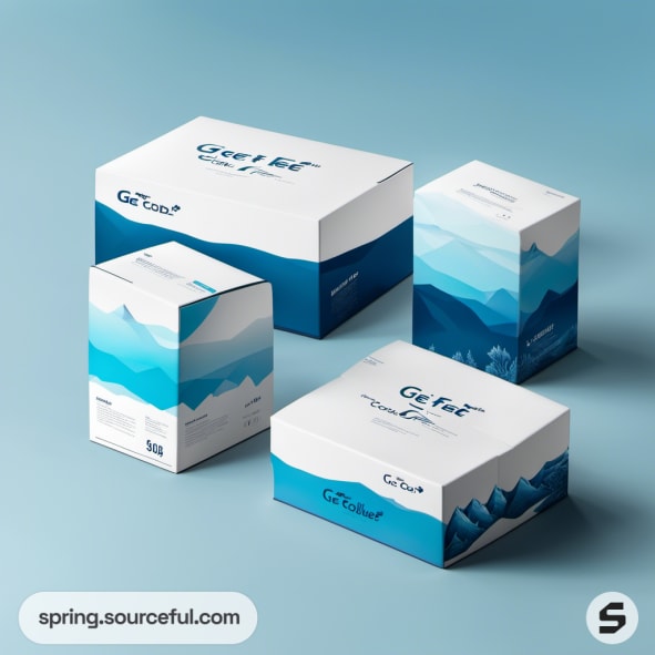 White and blue sneaker boxes with mountain design on a blue background.