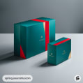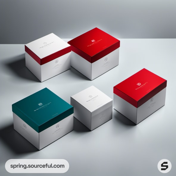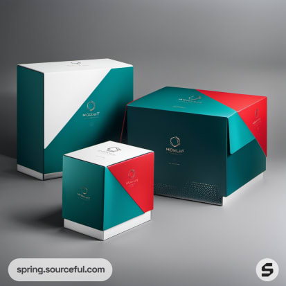 Diagonal split design on teal and red boxes against a gray backdrop.