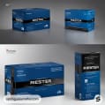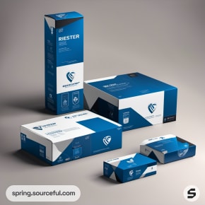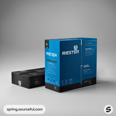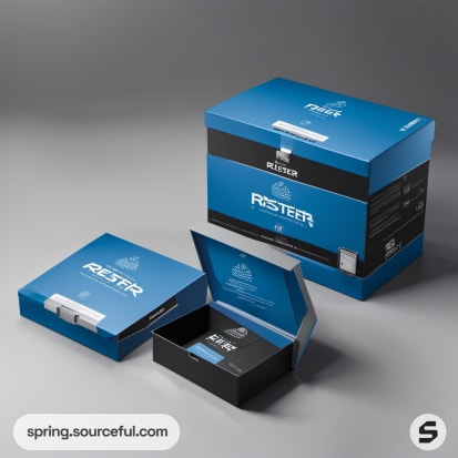 Blue and black rectangular product boxes with minimalistic branding.
