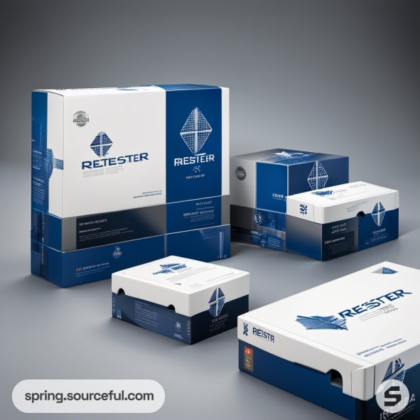 White and blue boxes with angular graphics and modern branding.