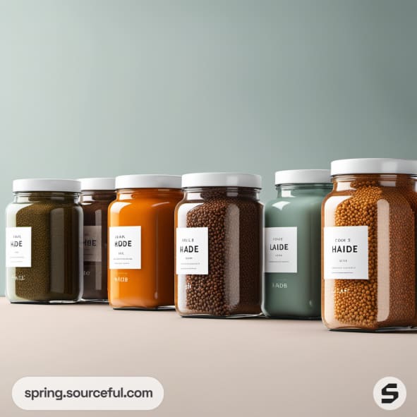 Variety of spices in glass jars with colorful labels.