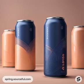 Tall, sleek beverage cans with a blue and peach gradient design, featuring abstract line patterns on a plain background.
