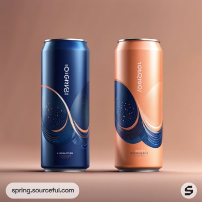 Two tall cans with abstract wave designs, one blue and one orange, on a soft peach background.