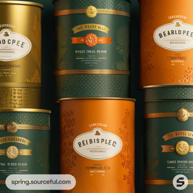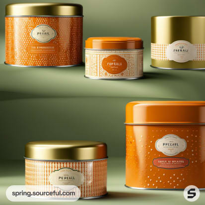 Assorted orange tins with gold and orange lids, featuring dotted and striped patterns, set against a green background.