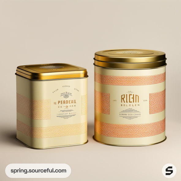 Two metal tins with beige and orange patterns, featuring gold lids, against a neutral background.