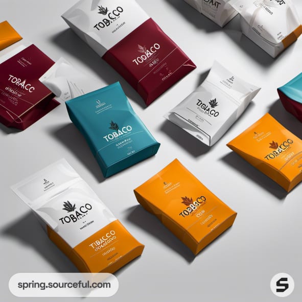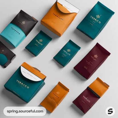 Variety of colorful rectangular pouches and boxes on a white surface.