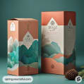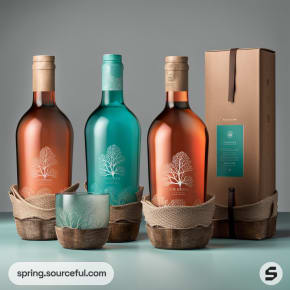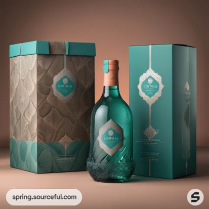 Bottles in peach and teal boxes with natural accents like cones.