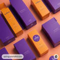 Mixed orange, purple, and white packaging boxes with diagonal designs.