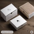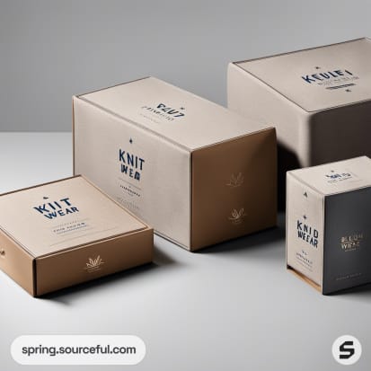 Four brown boxes of varying sizes with text and logo, minimalist style.