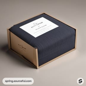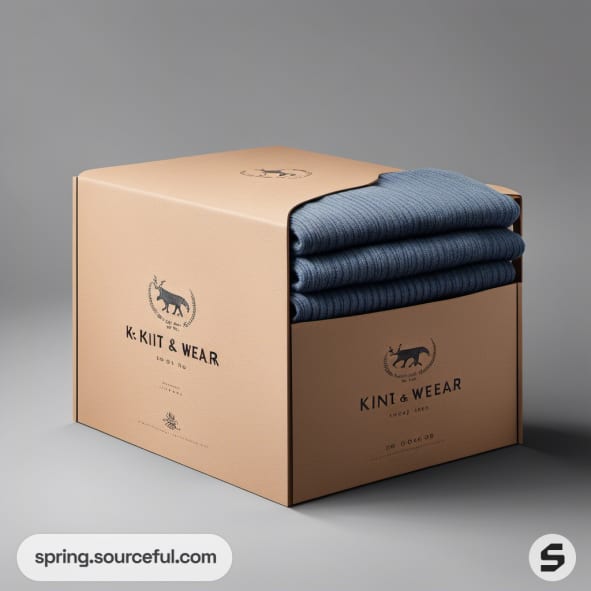Brown box with blue knitwear folded inside, logo and text visible.