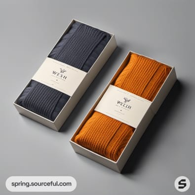 Two rectangular boxes with navy and orange knitwear, minimalist design.