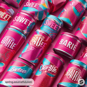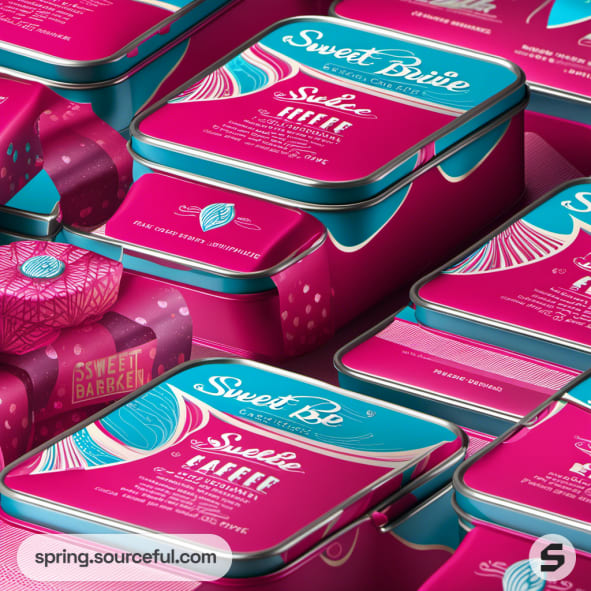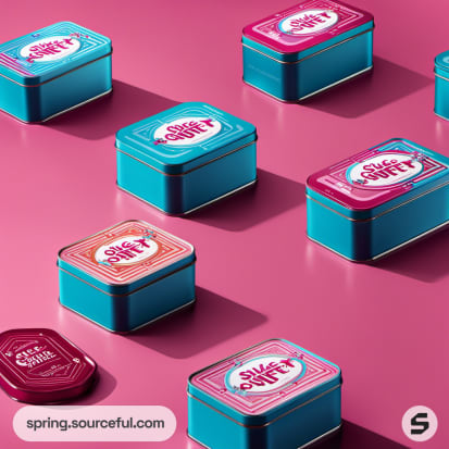 Bright pink and teal tins set on a vivid background.