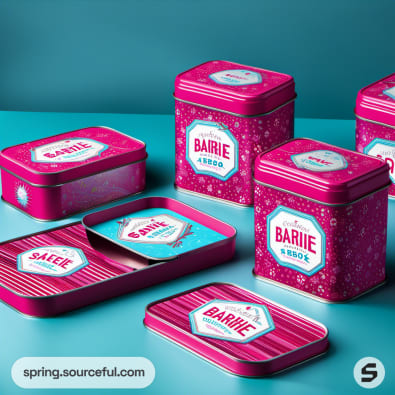 Vibrant pink tins with geometric patterns and lettering.