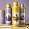 Tall cylindrical cans with floral designs in purple, yellow, and green, set against a soft purple backdrop.