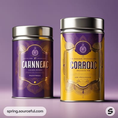 Two cylindrical tins with purple and yellow designs on a lavender background.