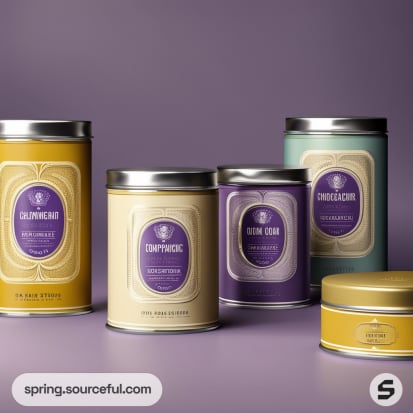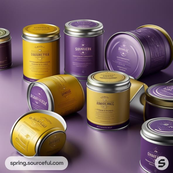 Stacked metal canisters with octagonal labels in purple and yellow hues, surrounded by sprigs of lavender.