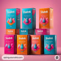 Variety of colorful packaging with vibrant designs and bold fonts.