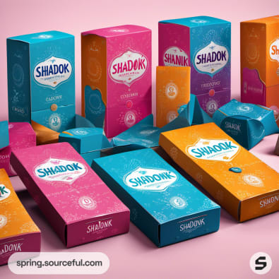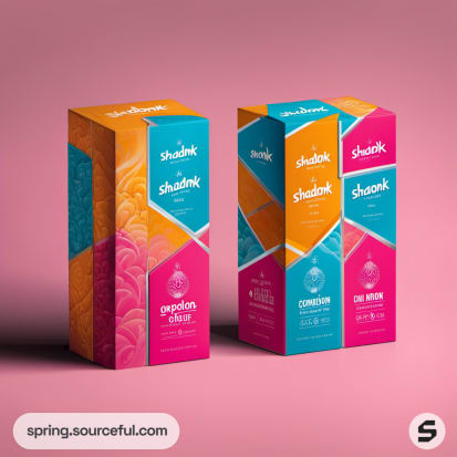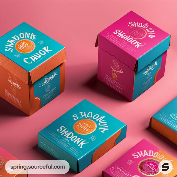 Various box sizes in vibrant designs with stylized patterns on a pink surface.